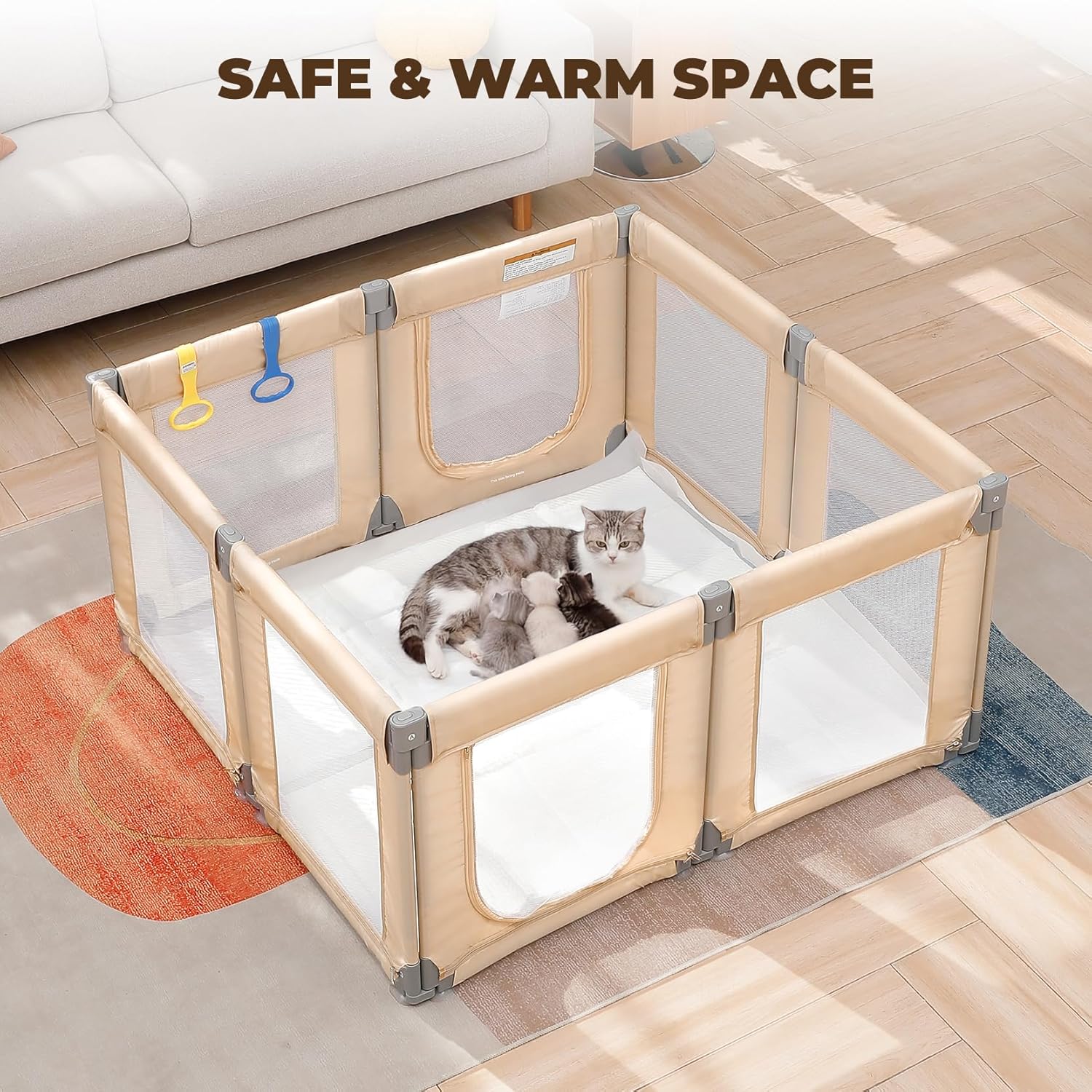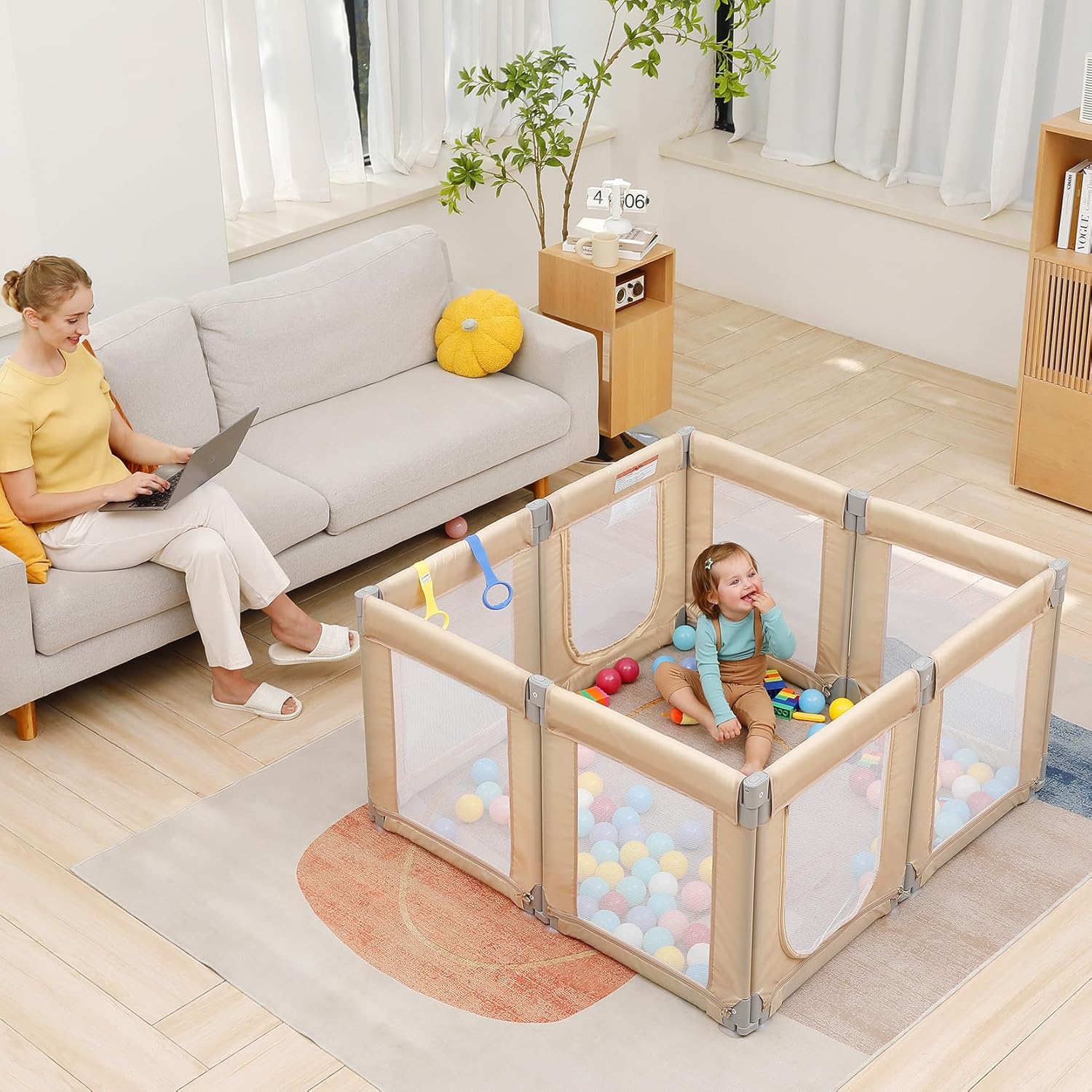 Color: Khaki Size: 49"×47" High: 27" tall Material: High-Quality Oxford Fabric & Durable Metal Frame Features: 1. Ultimate Portability & Space-Saving Design: This collapsible playpen sets up and folds down in seconds without any tools. Its compact, foldable design makes it incredibly easy to store in a closet, carry in your car, or take on the go. 2. Certified Safety for Peace of Mind: Constructed with durable, non-toxic materials and featuring all-around breathable, high-density mesh. This transparent fabric ensures maximum airflow and allows you to keep a watchful eye on your little one at all times. 3. Versatile for Any Adventure: Perfect for use in the living room, bedroom, or garden. This is the ideal portable playpen for indoor & outdoor use, whether you're at home, visiting grandparents, or on a family vacation. 4. The Perfect Sized Play Area: Measuring a generous 49" x 47", this small baby playpen provides ample room for your child to play, crawl, and explore with their favorite toys, without taking over your entire living space. 5. Simple & Secure Setup: The innovative locking system ensures each panel clicks firmly into place, creating a stable and secure baby fence play area that you can trust.