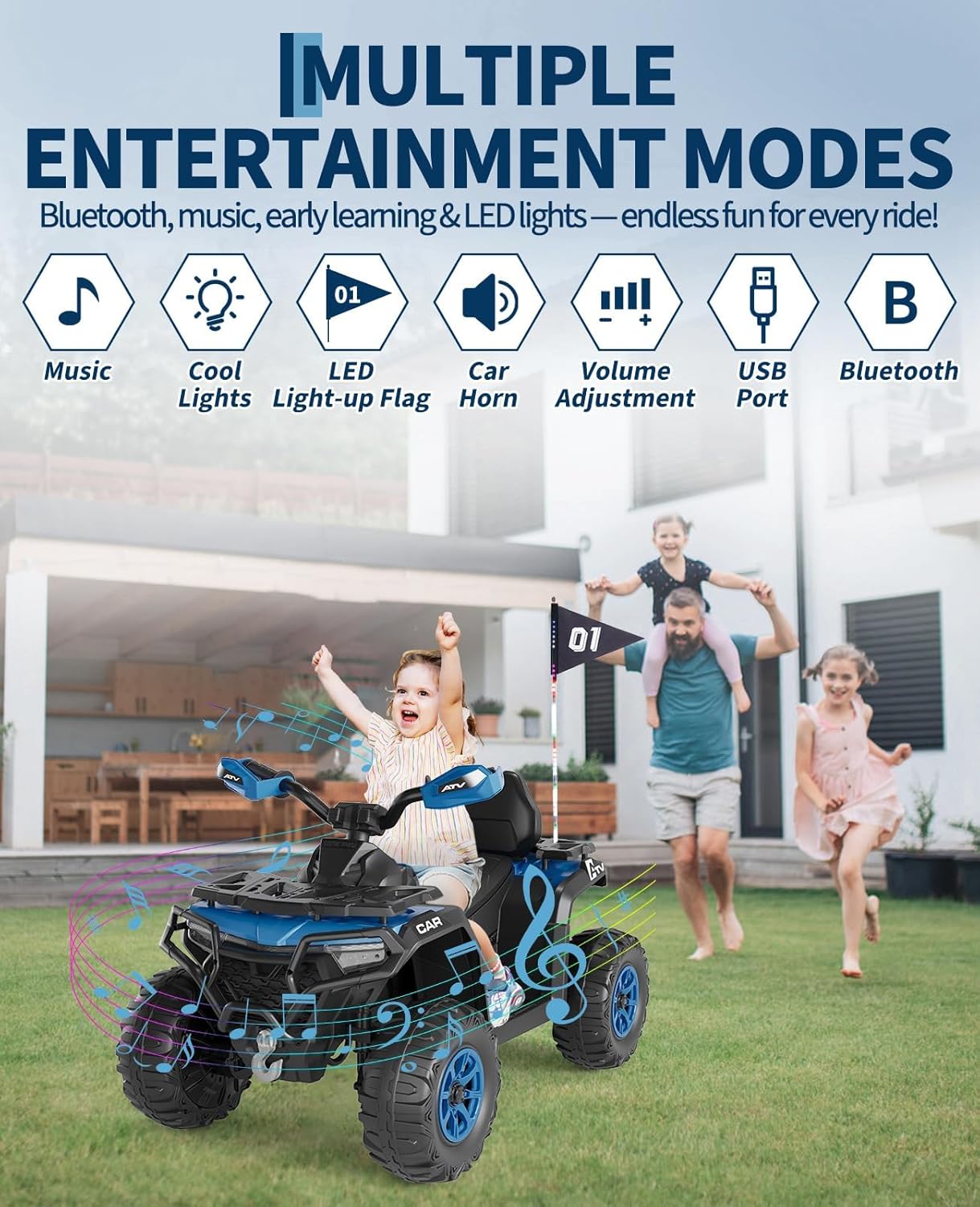 Product description: Discover the adventure - the electric quad for little explorers! Give your child the ultimate driving experience with our powerful electric quad. Designed for children from 3 to 8 years, this quad combines safety, fun and state-of-the-art equipment. Realistic driving experience. With user-friendly accelerator pedal, forward/reverse function and real LED headlights, your little driver will feel like a big one. The speed is safely limited to 3-8 km/h - ideal for beginners. Power for any terrain. Equipped with two powerful engines and large 36 cm deep tread tyres. Whether lawn, gravel path or field - this quad masters any terrain. The sturdy frame and child-safe construction give parents a safe feeling. Long-lasting 12 V 10 Ah battery. Enjoy up to 45 minutes of driving fun on a single charge! The powerful 12V 10Ah battery ensures long outdoor playtime. Charging time: approx. 8-12 hours. Music on the go. The built-in multimedia player with USB and TF card port makes every trip to the party. Simply play children's favourite songs and off you go! Perfect size for children. Dimensions: 95 x 56 x 55 cm (L x W x H). Maximum load: 30 kg. Suitable for children aged 3 to 8 years. Make your child happy - for unforgettable adventures in the garden or in the park!