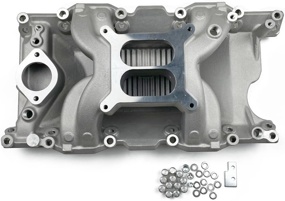 Features:For 396, 402, 427, and 454 V8's with OEM 4-bbl carb; For the stock manifold on Chevy big block engines with general duty oval port heads. Does not fit tall deck blocks.For 1965-'72 (1973 non-CA) passenger cars and 1966-1983 trucks, Suburban's and heavy vehicles, except stock equipped EGR. For Engine: 396, 402, 427, 454 VChevy big block Mark IV:1965-1970 6.5L/396 V81970-1972 6.6L/402 V81966-1969 7.0L/427 V81970-1990 7.4L/454 V8Chevy big block Gen V:1991-1995 7.4L/454 V8Chevy big block Gen VI:1996-2000 7.4L/454 V8Specification:Carburetor Mounting: 4-barrel spuare boreIntake Style: Dual Plane Material: AluminumFinish: SatinRPM Range: Idle - 6000Intake Manifold Height: 5.75"Port exit dimensions: 2.05" x 1.82"EGR or Non-EGR: non-EGRIncludes Gaskets: YesRequires Aftermarket Fuel Rails: NoCylinder Head Type: Oval Port- SmallPackage Contents:1x Intake manifold and some fittings as pictured