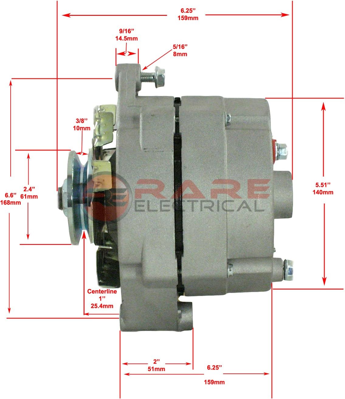 RAREELECTRICAL Brand Compatible With DELCO, GM, MAN, MINIUNIT TYPE: DELCOALTERNATOR FAMILY: DELCO 10SIVOLTAGE: 12 VOLTSAMPERAGE: 110 AMPSREGULATOR POSITION: 3: 00POLARITY: NEGATIVEALTERNATOR FAMILY TYPE: 100OUTPUT STUD DIMENSIONS: 12-24WEIGHT: 11.445 LBS / 5.20 KGPLEASE VERIFY YOUR OEM PART NUMBER FROM YOUR ORIGINAL UNIT TO HELP ENSURE FITMENT.BRAND NEW 110 AMP 1-WIRE & 3-WIRE CHROME ALTERNATOR THIS UNIT IS ONE OF THE FINEST AND MOST EFFICIENT GM ALTERNATORS ON THE MARKET TODAY. THE INSTALLATION IS VERY STRAIGHT FORWARD AND SIMILAR TO THE ORIGINAL UNIT YOU ARE REPLACING. WIRING IS SIMPLE BECAUSE OF THE SELF-EXCITING REGULATOR THAT USES ONLY A 1-WIRE HOOKUP OR YOU CAN USE THE 2 PRONG CONNECTION AND BATTERY CONNECTION. MANUFACTURED WITH 100% NEW COMPONENTS HIGH TEMP WINDINGS EXCLUSIVE OE EQUIVALENT RECTIFIER AND REGULATOR DURABLE CHROME FINISH EASY 1-WIRE HOOKUP THIS NEW UNIT IS A DIRECT BOLT-IN REPLACEMENT TO ANY GM ALTERNATOR FROM 1965-1986. WORKS GREAT FOR MUSCLE CARS OR STREET RODS. THE BILLET MACHINED ALUMINUM DRIVE PULLEY ASSURES COMPLETE BELT CONTACT AND MINIMIZING THROWING BELTS LIKE COMPETITORS STAMPED PULLEYS CAN.