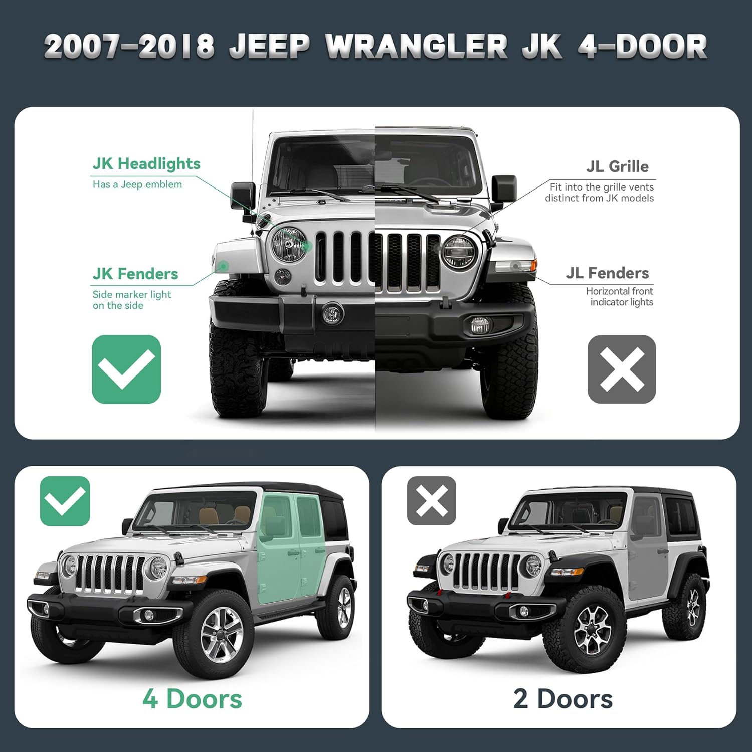 | Compatible with Vehicle Type | Compatible with 2007-2018 Jeep Wrangler JK JKU Unlimited 4 Door |