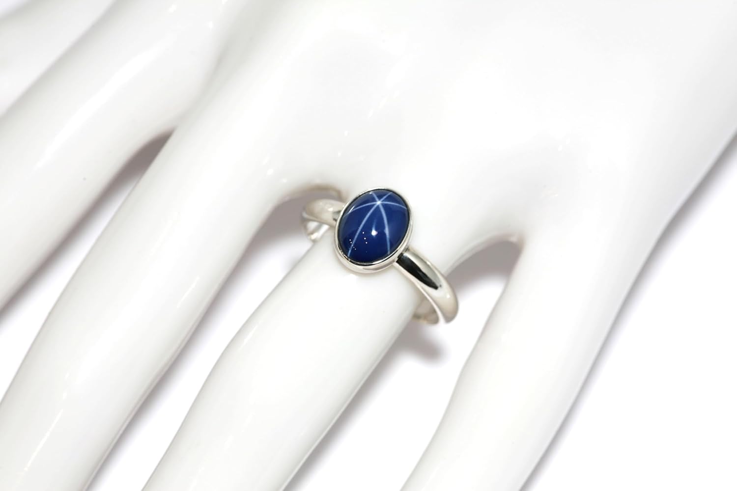 This ring features a bezel mounted 10 x 8mm lab created Star Sapphire N-S mounted on a 3.25mm wide Sterling Silver Plain band. Polished to a bright finish. Polishing cloth and ring sizer included.