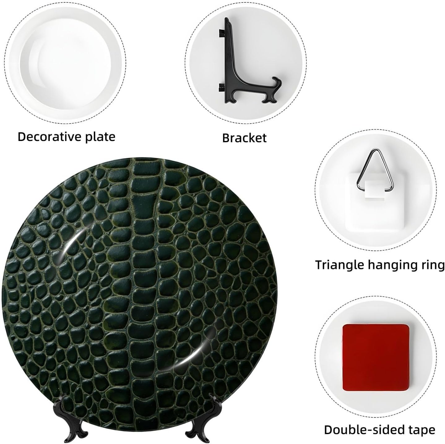 Material: High-Quality Ceramic PlateComponents: Decorative Plate, Stand, Hook, And Adhesive StripDurable & Smooth: Crafted From Sturdy Ceramic, This Plate Offers Lasting Durability And A Smooth Surface That Ensures Safe Handling With No Sharp Edges. Perfect Ceramic Plate For Display Or Wall Hanging Plate Use.Customizable Décor: Personalize The Plate With Your Favorite Patterns To Create A Unique Piece Of China. Ideal Decorative Plate For Home Décor, Complementing Your Style In Different Rooms.Easy Installation: The Adhesive Strip Design Allows For Simple Mounting And Removal, Leaving No Residue Behind. Setting It Up Is Quick And Hassle-Free.Dual Display Options: Display The Plate In 3d By Placing It On The Included Stand, Or Hang It On The Wall For A Sleek, Stylish Look. Both Options Make This 10 Inch Plate A Versatile Display Plate.Perfect For Any Room: This Decorative Plate Is Perfect For Enhancing The Aesthetic Of Study Rooms, Offices, Or Entryways, Offering A Sophisticated Touch To Any Setting. Ideal Display Plate With Stand For Home Décor.