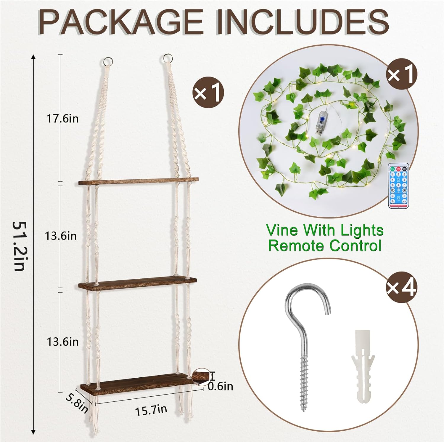 Hanging Shelf with Vine Lights(USB Powered), Macrame Shelf, Wall Shelf with Handmade Ropes, 3 Tier Floating Shelf, Boho Room Decor Aesthetic for Succulents, Bedroom, Living Room, Bathroom