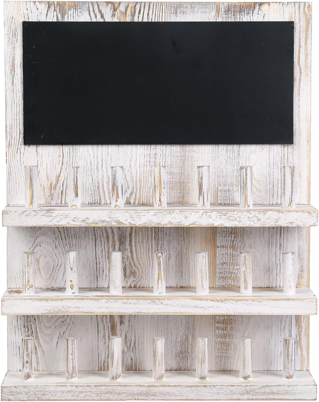 A must-have for extensive personal collections and retail displays, this shabby whitewashed wood ring storage rack features 21 pegs that each hold 5 or more rings for a total of over 100 rings. Capable of being mounted to a wall or used freestanding on a table or counter, this versatile display shelf has the look of a vintage store fixture, giving a rustic bohemian décor style. The erasable chalkboard provides a customizable sign to merchandise products or add decorative artwork and can be wiped clean with a damp cloth. Ideal for medallions and sports rings collectors for use at home, this display stand is also portable, making it perfect for travel to craft fairs or shows, market vendors, or small shop retailers.**Mounting hardware not included****Includes regular chalk; Not intended for use with liquid chalk markers**Approximate Dimension: Overall - 11.8 L x 3.0 W x 15.0 H; Chalkboard Surface - 10.4 L x 4.7 H; Wooden Pegs - 1.6 H x 0.5 Diameter; Space Between Tiers - 2.6 H (in inches)
